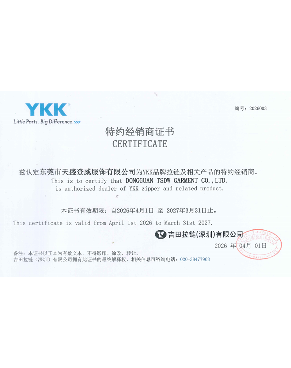 Dongguan D.W. Garment Accessories Co. Ltd. is the same as Dongguan TSDW Garment Accessories Co. Ltd. , a certified authorized distributor of YKK Zipper (SHENZHEN) Co., Ltd. We specialize in all kinds of YKK zippers, plastic hardware, hook and loop fasteners, webbing tapes, and snap and buttons.